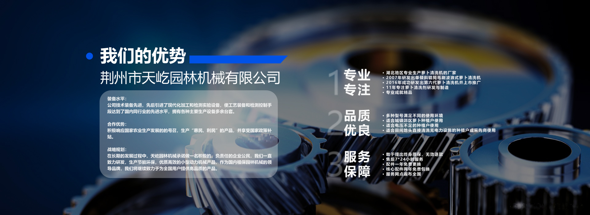 荊州市天屹園林機(jī)械有限公司坐落于歷史文化名城湖北省荊州市荊州區(qū)。本公司是一家從事小型機(jī)械動(dòng)力產(chǎn)品研發(fā)、生產(chǎn)的獨(dú)資民營(yíng)企業(yè)。公司注冊(cè)資金500萬(wàn)元,現(xiàn)有員工60余人、公司在全國(guó)多個(gè)省市區(qū)設(shè)有多家經(jīng)銷和服務(wù)點(diǎn),在國(guó)內(nèi)創(chuàng)“售前培訓(xùn)、產(chǎn)品銷售、配件供應(yīng)、售后服務(wù)”四位一體的營(yíng)銷模式。專門配備售后服務(wù)車,設(shè)立售后服務(wù)備件庫(kù),以在第一時(shí)間滿足用戶的不同需求。 經(jīng)營(yíng)范圍:果蔬清洗機(jī)(白蘿卜清洗機(jī),胡蘿卜清洗機(jī);荸薺清洗機(jī);土豆清洗機(jī);冬瓜清洗機(jī);生姜清洗機(jī)等)。公司主要產(chǎn)品有園林機(jī)械、植保機(jī)械等,其中公司以蘿卜清洗機(jī)系列占主導(dǎo)地位。銷售網(wǎng)絡(luò)及售后服務(wù)遍布國(guó)內(nèi)多個(gè)省市。 裝備水平:公司技術(shù)裝備先進(jìn),先后引進(jìn)了現(xiàn)代化加工和檢測(cè)實(shí)驗(yàn)設(shè)備,使工藝裝備和檢測(cè)控制手段達(dá)到了國(guó)內(nèi)同行業(yè)的先進(jìn)水平,擁有各種主要生產(chǎn)設(shè)備多余臺(tái)套。 合作優(yōu)勢(shì):積極響應(yīng)國(guó)家農(nóng)業(yè)生產(chǎn)發(fā)展的的號(hào)召,生產(chǎn)“惠民、利民”的產(chǎn)品,并享受國(guó)家政策補(bǔ)貼。 戰(zhàn)略規(guī)劃:在長(zhǎng)期的發(fā)展過(guò)程中,天屹園林機(jī)械承諾做一名積極的,負(fù)責(zé)任的企業(yè)公民,我們一直致力研發(fā),生產(chǎn)節(jié)能環(huán)保,優(yōu)質(zhì)高效的小型動(dòng)力機(jī)械產(chǎn)品,作為國(guó)內(nèi)植保園林機(jī)械的領(lǐng)導(dǎo)品牌,我們將繼續(xù)致力于為全國(guó)用戶提供優(yōu)質(zhì)的產(chǎn)品。 MORE